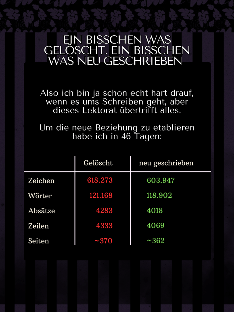 Jetzt sitze ich wieder mit dem Lektorat von Band 1 hier. Bin schon wieder über der Deadline und fühle mich mies deswegen. Aber ich hing auch an einer richtig doofen Stelle fest. Mir wurden ein paar größere Sachen angemerkt, die ich sehr gut nachvollziehen kann und die dazu geführt haben, dass ich einen großen Punkt im Plot noch einmal anfasse. Jetzt ist es stimmig. Ich erkläre sogar plötzlich ihre Haar- und Augenfarbe. Das Ende steht durch das Lektorat inzwischen auch fest und seit gestern kenne ich das »Warum«.