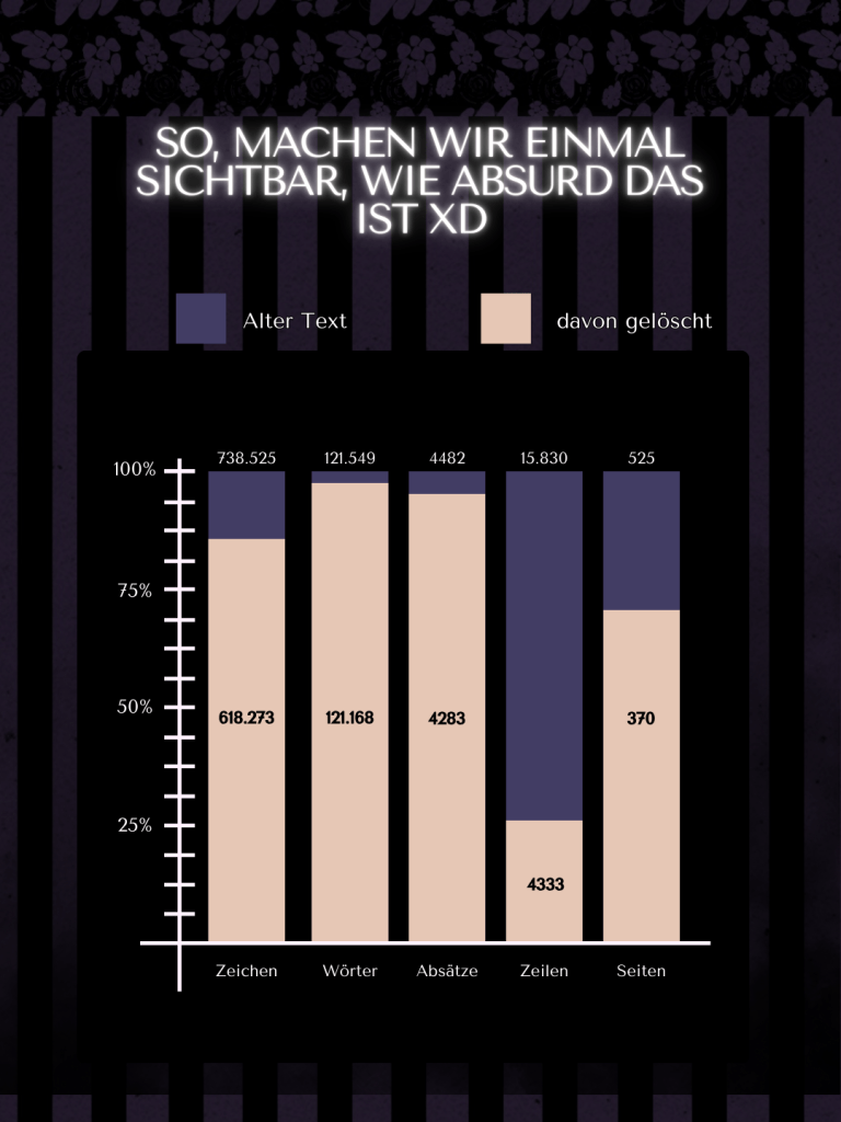 Klirr. Riesenproblem. Denn er hatte natürlich Recht und das ergab nicht einmal in einer Fantasywelt Sinn. Aber was nun? Wir hatten inzwischen Januar 2025 und im August oder so sollte das Lektorat beginnen. August. Noch so weit weg. Ich muss doch nur ein paar Details anpassen … Ich glaube, im Juni habe ich dann angefangen. Erst ein bisschen gelesen und dann das Buch für Müll befunden.